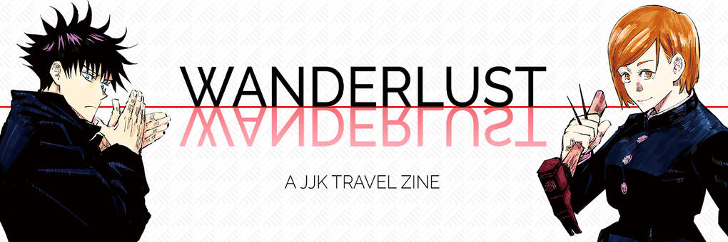 Wanderlust: A JJK Travel Zine is a newly announced Jujutsu Kaisen travel themed fanzine! Whether it’s Gojo and Geto relaxing on the warm sandy beach in sunny Okinawa or the first year trio sent on a mission abroad to exorcise spirits or a close-up of Yuta’s travels when he was overseas - the scenarios are endless!The zine aims to depict the beauty of various locations along with the fun and lighthearted memories made showcased through illustrations and written pieces along with merch items. The zine will be an A5 physical book, general (no romantic ships), SFW and canon-compliant.